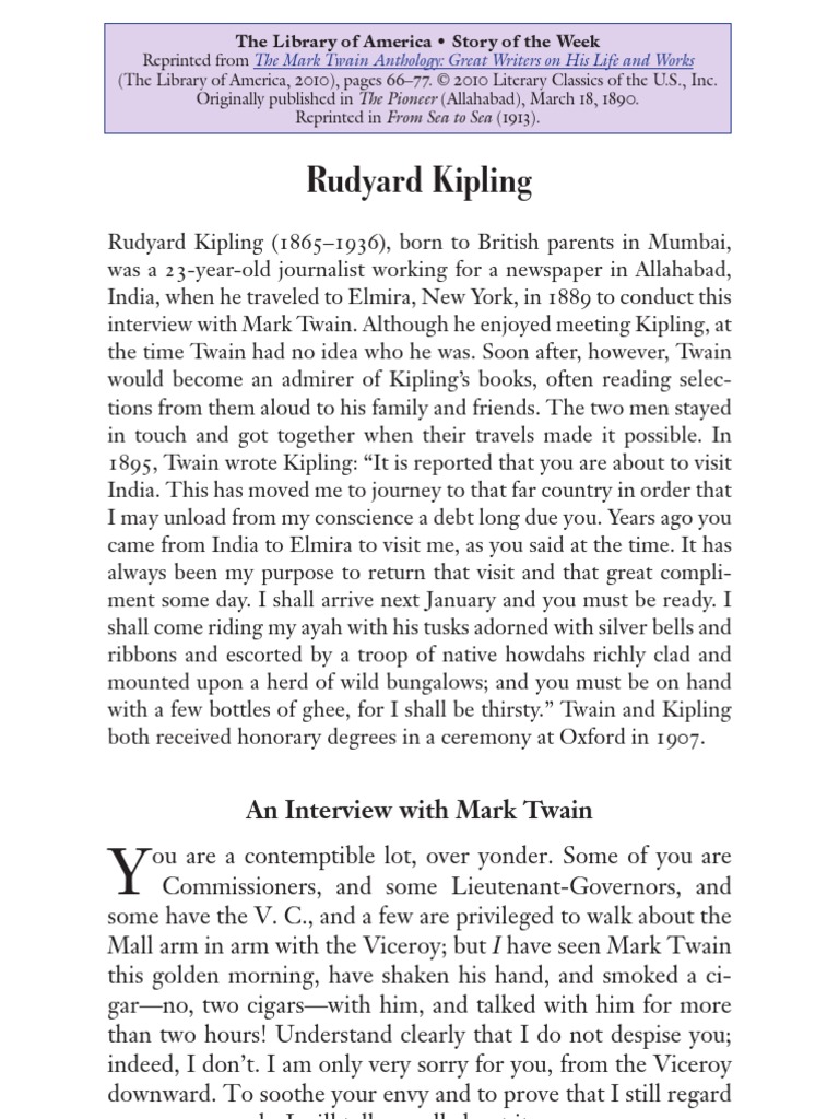 to conduct this interview with Mark Twain. Although he enjoyed meeting Kipling, at the time Twain had no idea who he was. Soon after, however, Twain would become an admirer of Kipling’s books, often reading selec-tions from them aloud to his family and friends. The two men stayed in touch and got together when their travels made it possible. In