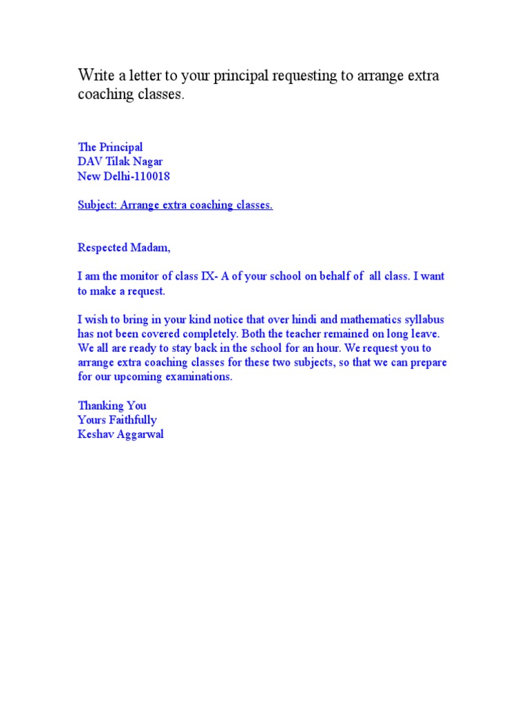 Write a letter to your principal requesting to arrange extra