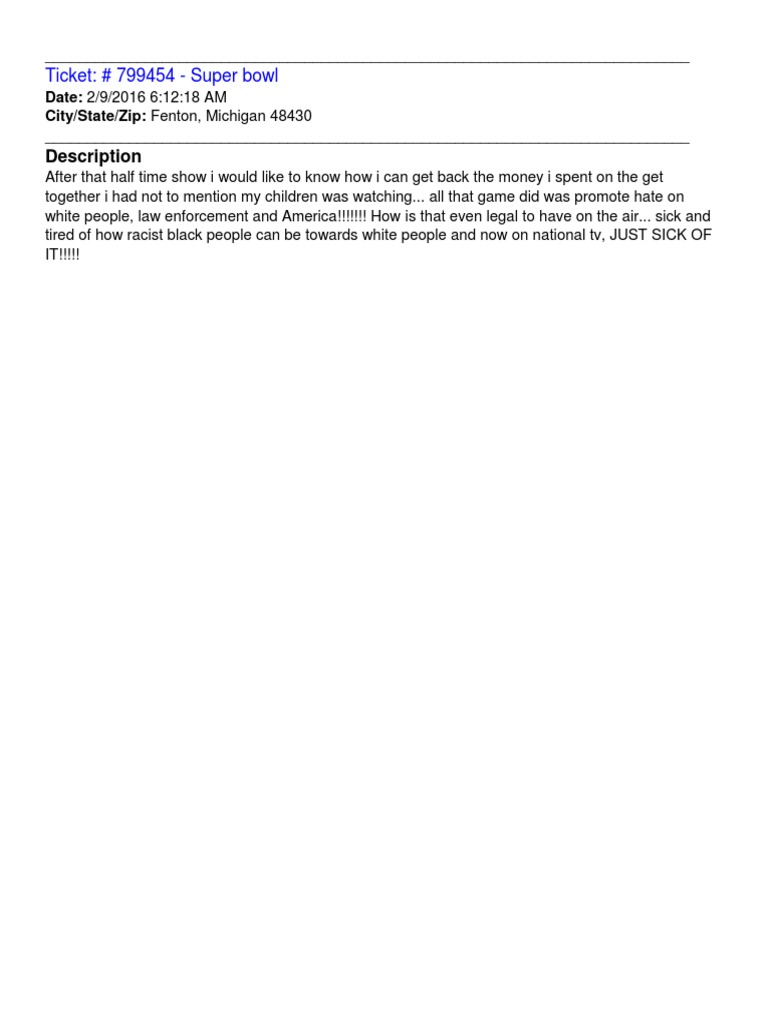 After that half time show i would like to know how i can get back the money i spent on the get together i had not to mention my children was watching... all that game did was promote hate on white people, law enforcement and America!!!!!!! How is that even legal to have on the air... sick and tired of how racist black people can be towards white people and now on national tv, JUST SICK OF IT!!!!!
