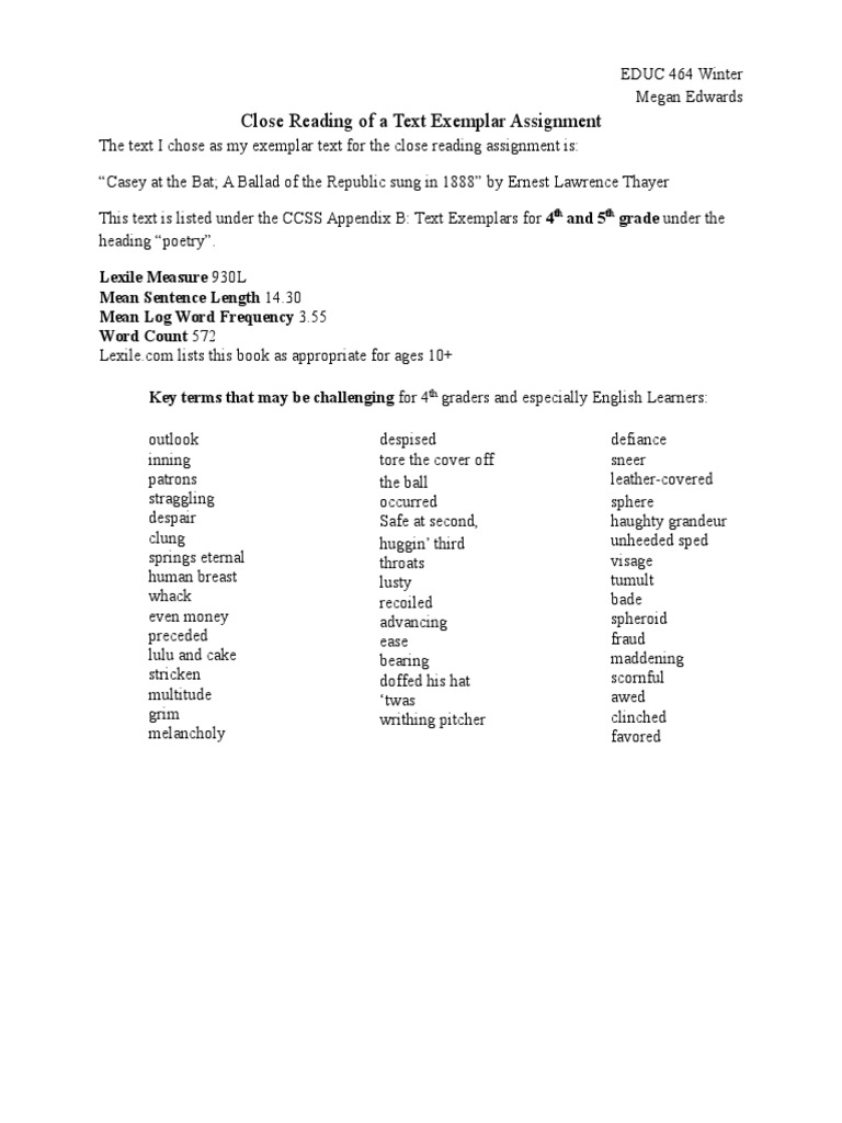 Close Reading of a Text Exemplar Assignment