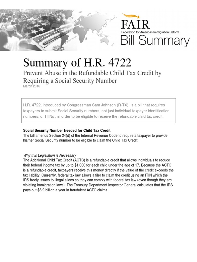 H.R. 4722, introduced by Congressman Sam Johnson (R-TX), is a bill that requires taxpayers to submit Social Security numbers, not just individual taxpayer identification numbers, or ITINs , in order to be eligible to receive the refundable child tax credit.