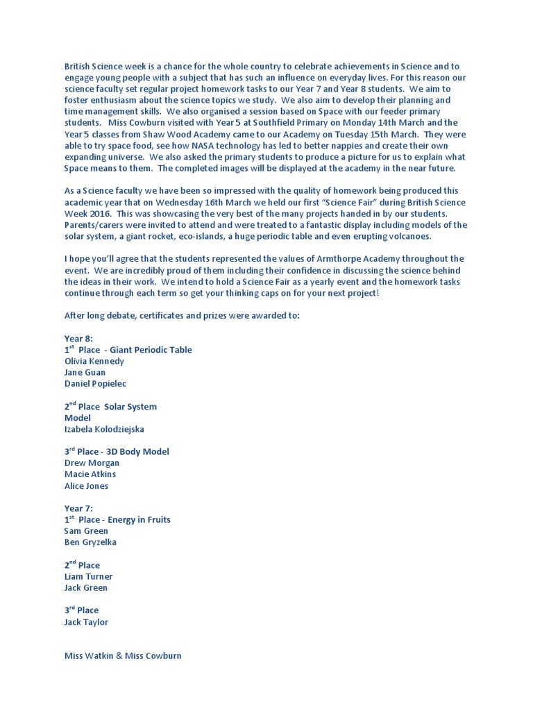 academic year that on Wednesday 16th March we held our first Science Fair during British Science