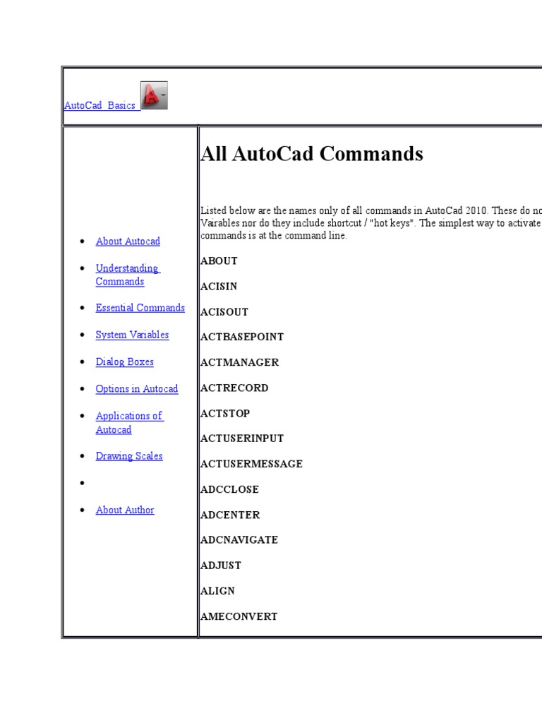 Listed below are the names only of all commands in AutoCad 2010. These do no