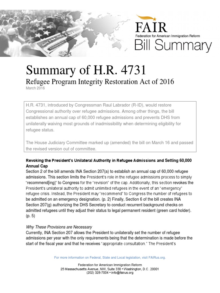 H.R. 4731, introduced by Congressman Raul Labrador (R-ID), would restore Congressional authority over refugee admissions. Among other things, the bill establishes an annual cap of 60,000 refugee admissions and prevents DHS from unilaterally waiving most grounds of inadmissibility when determining eligibility for refugee status. The House Judiciary Committee marked up (amended) the bill on March 16 and passed the revised version out of committee.