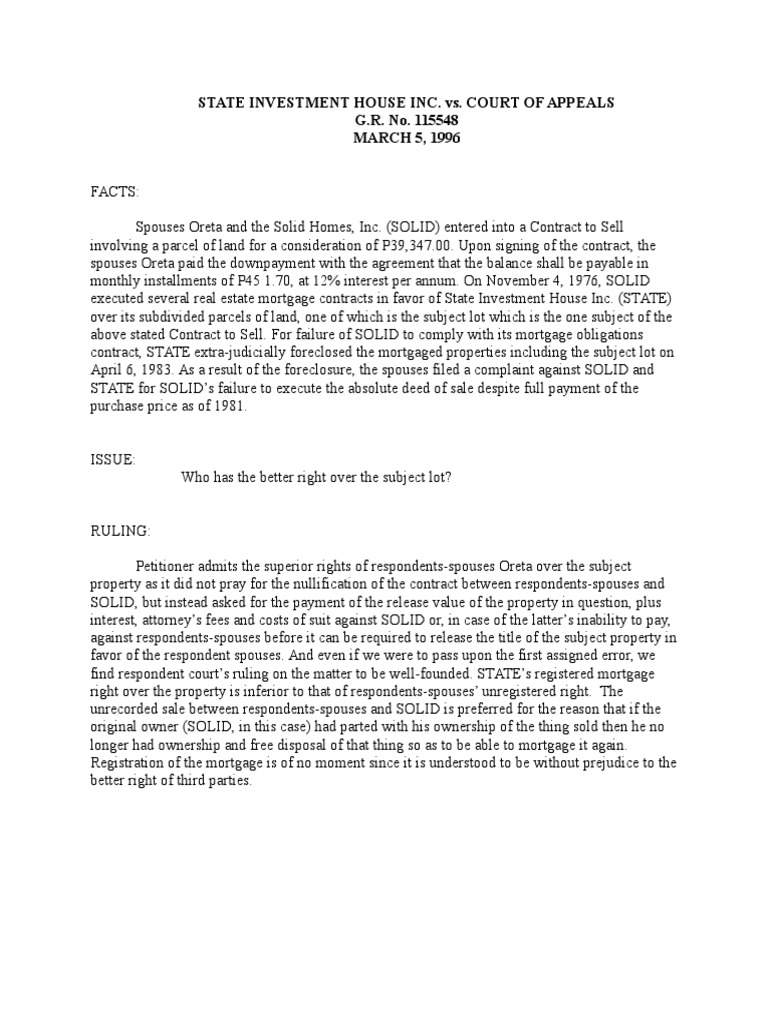 Spouses Oreta and the Solid Homes, Inc. (SOLID) entered into a Contract to Sell