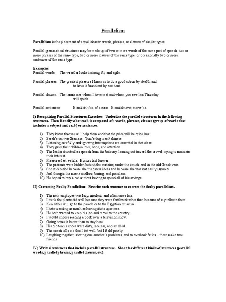 I) Recognizing Parallel Structures Exercises: Underline the parallel structures in the following