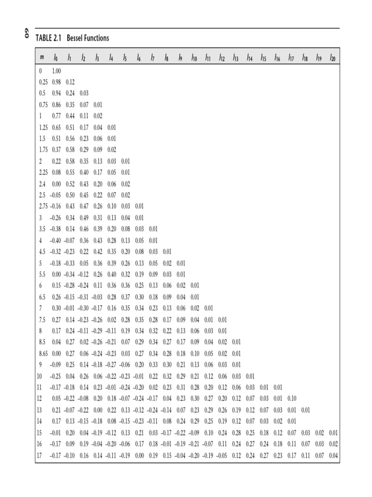 The document contains a table of values for Bessel functions J0 through J20 for values of m from 0 to 17.5 in increments of 0.25. The table lists the calculated values for each Bessel function across different values of m.