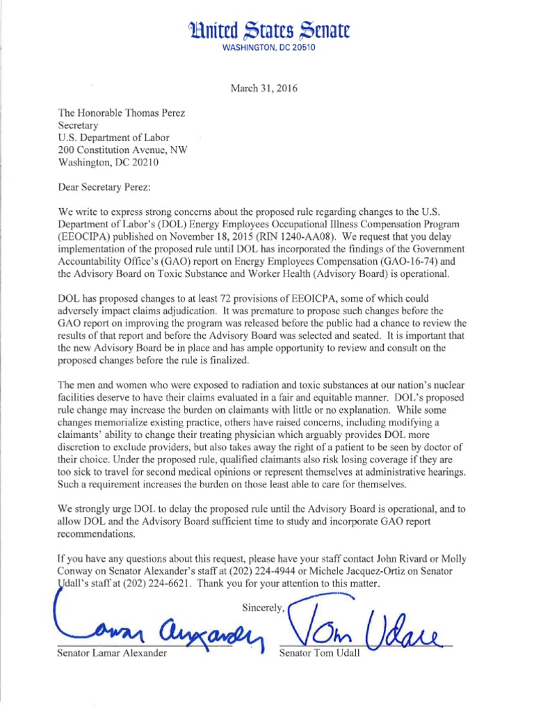 U.S. Sens. Tom Udall (D-N.M.) and Lamar Alexander (R-Tenn.) this week urged the U.S. Department of Labor to delay a new rule that could make it more difficult for sick nuclear workers who served at Los Alamos, Oak Ridge, Y-12 and other Cold War-era nuclear sites to get benefits they deserve under the department’s Energy Employees Occupational Illness Compensation Program.
