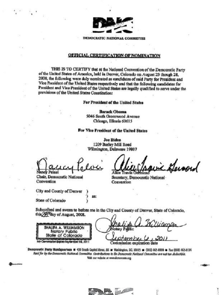 20 Jan 2009: As filed and stated on page 19 of the 2nd Amended Complaint of the Kerchner v Obama & Congress lawsuit initially filed on 20 Jan 2009, DNC Chairperson Nancy Pelosi issued & signed two different Certification Forms for Obama in 2008. In the first one which was only sent to the state of Hawaii it included the normal language that Obama met the constitutional eligibility requirements. But in the second one which she sent to the other 49 states she omitted that language. The RNC in the 2008 included the constitutional eligibility language in all its certification forms to all 50 states. Why did the DNC and Nancy Pelosi leave out the constitutionally eligible language to every single state except Hawaii, the alleged place of Obama's birth. Did Hawaii demand extra CYA protection from the DNC and Nancy Pelosi before they would put Obama on the ballot in Hawaii because people in Hawaii knew things about Obama the other 49 states did not know. It is the responsibility of the political parties to certify a candidate is eligible for the office they are running for. In the case of Obama, the DNC and Nancy Pelosi did not certify that Obama was eligible under the Constitution in 49 of the 50 states.