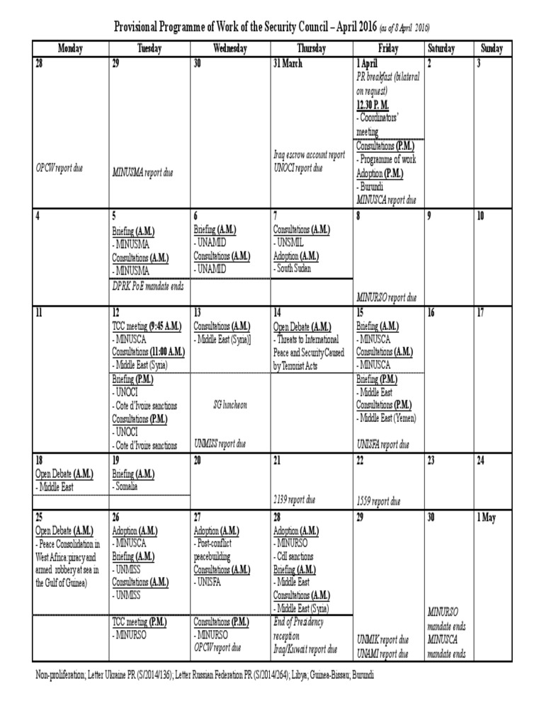 Provisional Programme of Work of the Security Council April 2016 (as of 8 April