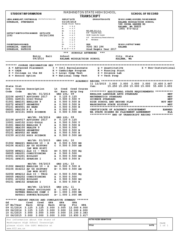 Washington High School Transcript