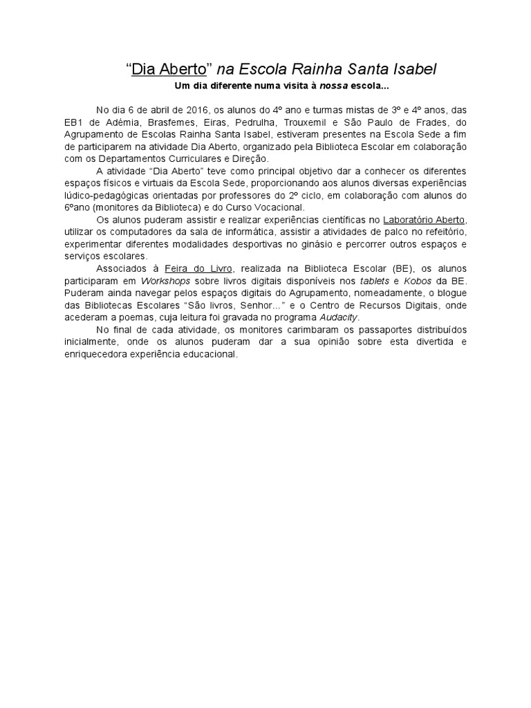 Dia Aberto na Escola Rainha Santa Isabel