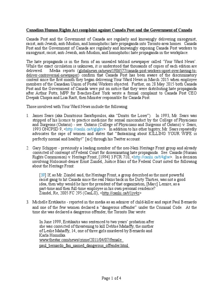Canada Post and the Government of Canada are regularly and knowingly delivering misogynist, racist, anti-Jewish, anti-Muslim, and homophobic hate propaganda into Toronto-area homes. Canada Post and the Government of Canada are regularly and knowingly exposing Canada Post workers to misogynist, racist, anti-Jewish, anti-Muslim, and homophobic hate propaganda in the workplace. The hate propaganda is in the form of an unsealed tabloid newspaper called ‘Your Ward News’. While the exact circulation is unknown, it is understood that thousands of copies of each edition are delivered. Media reports (
