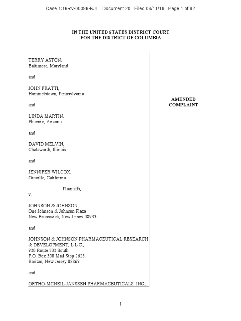 TERRY ASTON, Baltimore, Maryland and JOHN FRATTI, Hummelstown, Pennsylvania and LINDA MARTIN, Phoenix, Arizona and DAVID MELVIN, Chatsworth, Illinois and JENNIFER WILCOX, Oroville, California Plaintiffs, v. JOHNSON & JOHNSON, One Johnson & Johnson Plaza New Brunswick, New Jersey 08933 and JOHNSON & JOHNSON PHARMACEUTICAL RESEARCH & DEVELOPMENT, L.L.C., 920 Route 202 South P.O. Box 300 Mail Stop 2628 Raritan, New Jersey 08869 and ORTHO-MCNEIL-JANSSEN PHARMACEUTICALS, INC.,