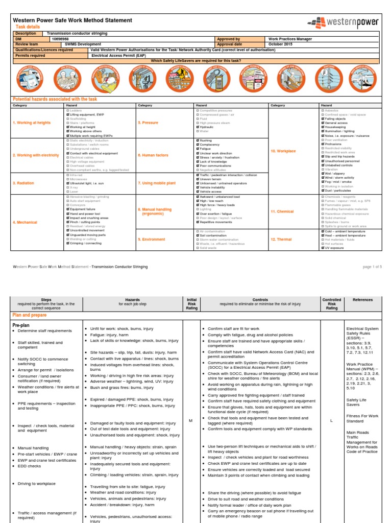 Western Power Safe Work Method Statement Transmission Conductor Stringing