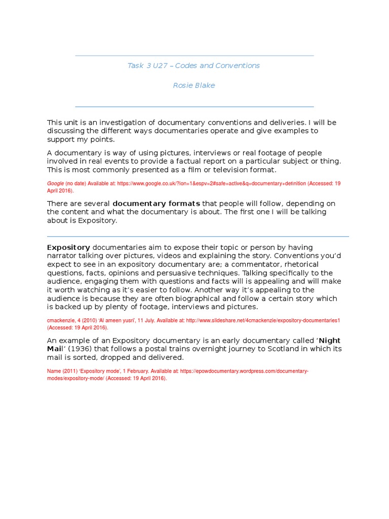 Name (2011) Expository mode, 1 February. Available at: https://epowdocumentary.wordpress.com/documentarymodes/expository-mode/ (Accessed: 19 April 2016).