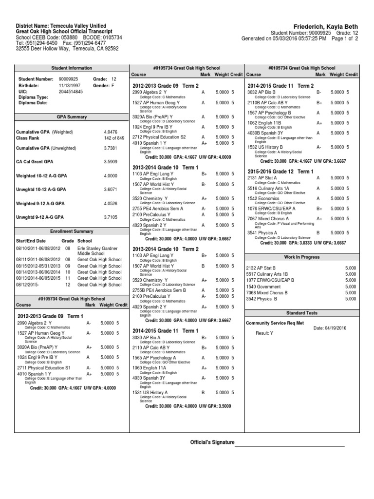 Credit: 30.000 GPA: 4.1667 U/W GPA: 3.6667