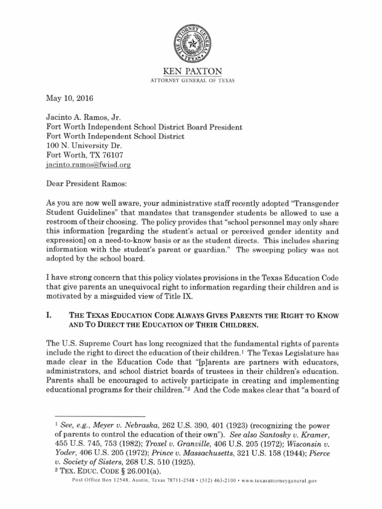 Texas AG Ken Paxton letter to Fort Worth ISD President