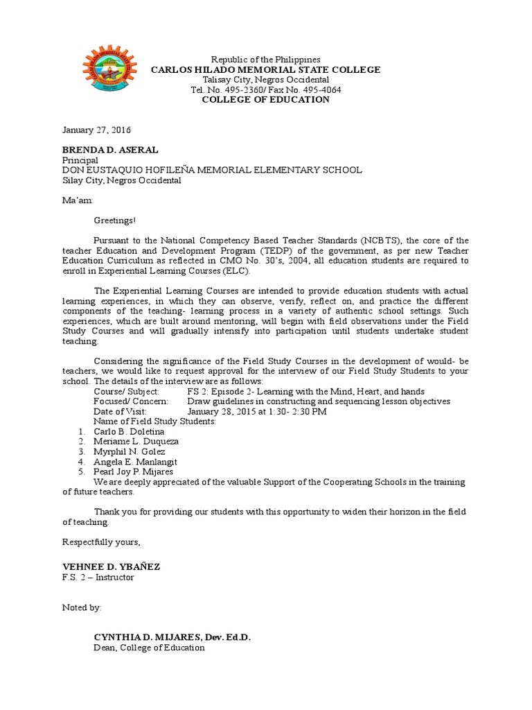 teachers, we would like to request approval for the interview of our Field Study Students to your