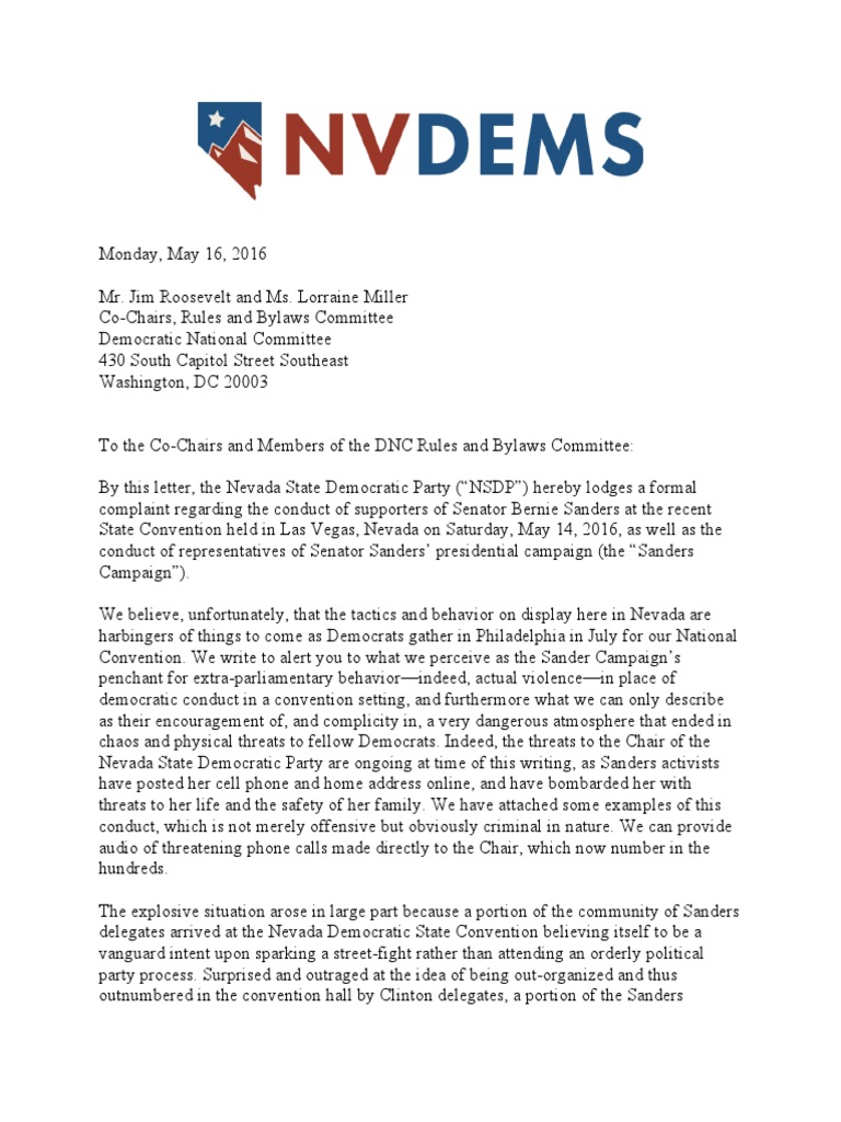 The Nevada State Democratic Party filed a formal complaint against the Bernie Sanders campaign regarding their behavior at the Nevada Democratic convention. Sanders delegates rushed the stage, shouted down speakers, and created an atmosphere of intimidation. A Sanders campaign official also tried to sow further chaos by presenting an unauthorized report alleging fraud against Sanders delegates. The letter warns that similar disruptive tactics may occur at the Democratic National Convention and requests the DNC's attention to the matter.
