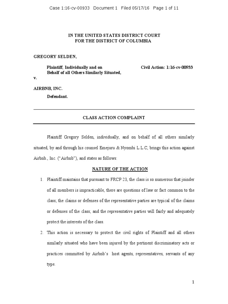 Plaintiff Gregory Selden, individually, and on behalf of all others similarly situated, by and through his counsel Emejuru & Nyombi L.L.C, brings this action against Airbnb., Inc. (“Airbnb”), and states as follows: