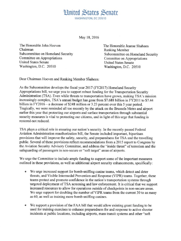 05172016 TSA Approps Letter Signed FINAL