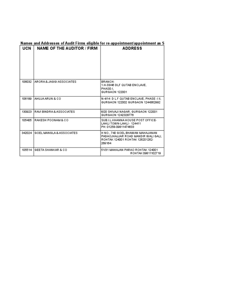 Names and Addresses of Audit Firms eligible for re-appointment/appointment as Statutory Central Auditors (SCAs) fo