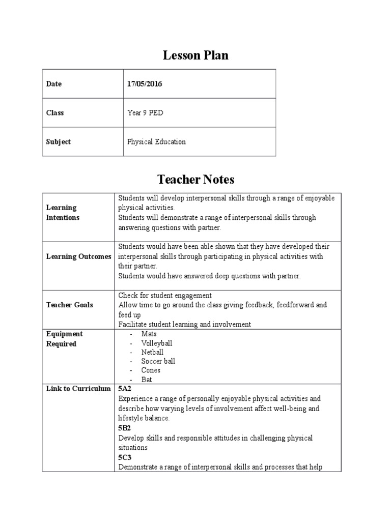 Learning Outcomes interpersonal skills through participating in physical activities with