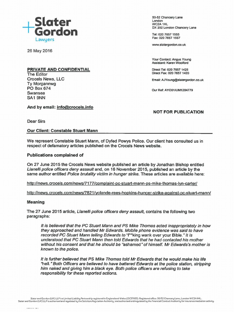 Letter From The Solicitors of PC Stuart Mann of Dyfed Powys Police