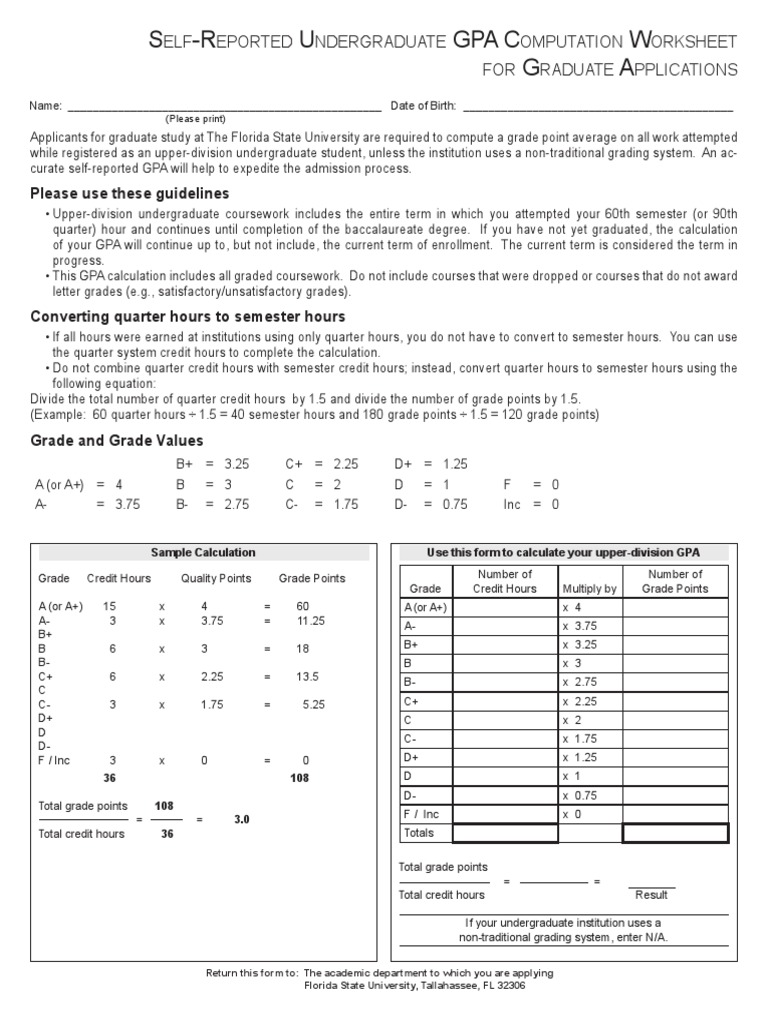 Applicants for graduate study at The Florida State University are required to compute a grade point average on all work attempted