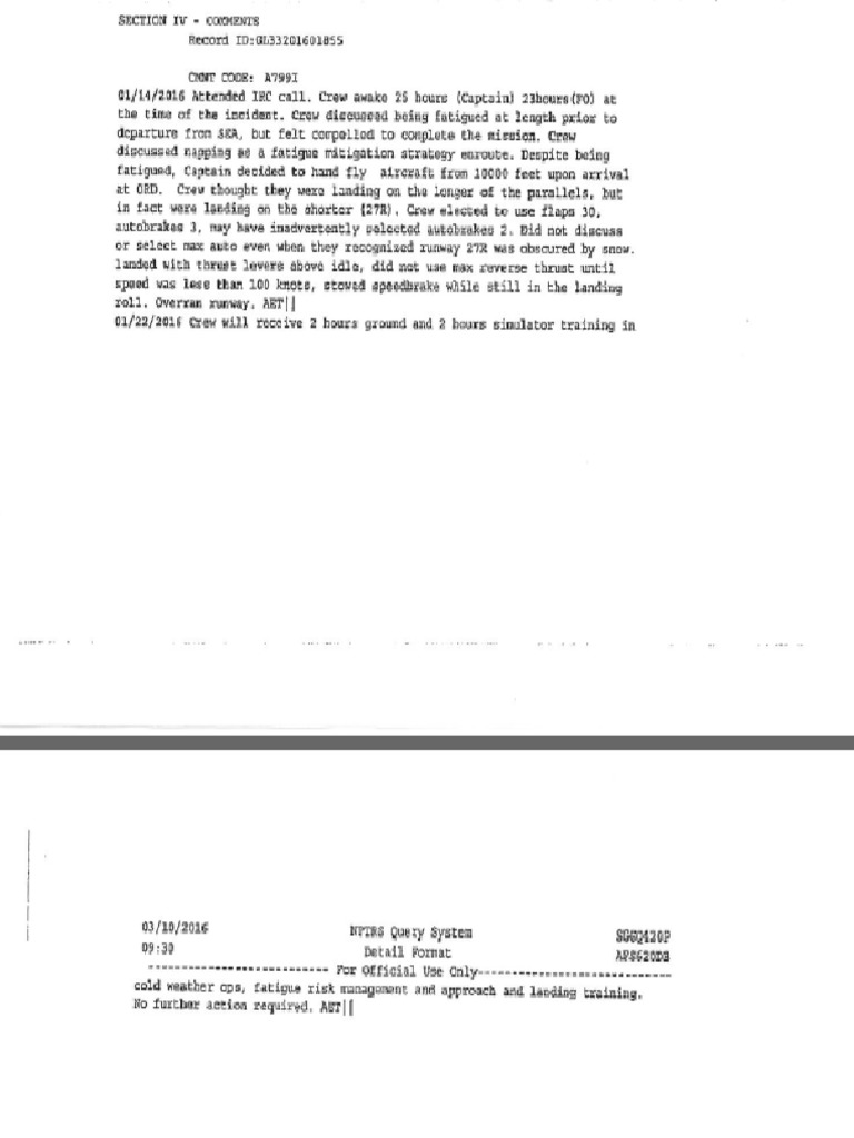 From a Federal Aviation Administration report, obtained by the Chicago Sun-Times, on a Dec. 30, 2015, incident at O'Hare Airport in Chicago in which United Airlines Flight 1977 slid off the end of a runway. The report notes the pilots' lack of sleep and that they had spoken of feeling “fatigued” even before departing Seattle for Chicago with more than 160 passengers on board.