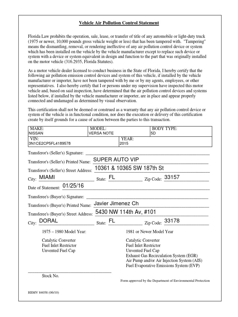 Florida Law prohibits the operation, sale, lease, or transfer of title of any automobile or light-duty truck