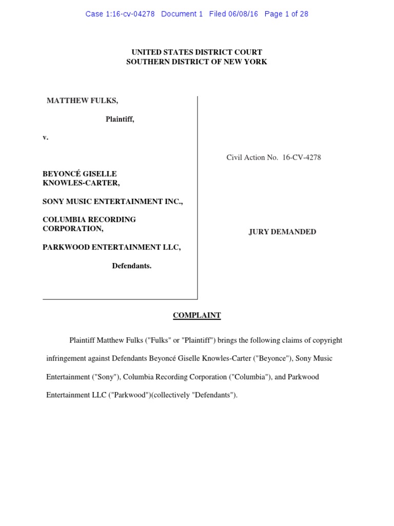 Plaintiff Matthew Fulks ("Fulks" or "Plaintiff")brings the following claimsof copyrightinfringementagainst DefendantsBeyoncé Giselle Knowles-Carter("Beyonce"),Sony MusicEntertainment("Sony"),ColumbiaRecording Corporation("Columbia"),andParkwoodEntertainmentLLC("Parkwood")(collectively"Defendants").