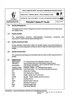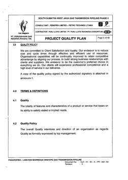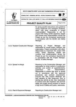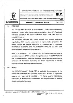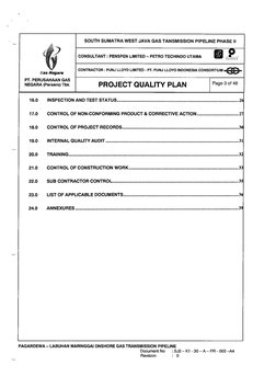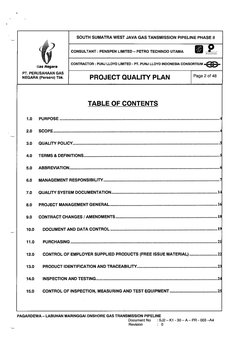 Purpose: Explains the goals of the Project Quality Plan and defines its application to quality control and quality assurance. Scope: Outlines the extent and boundaries of the project, including the responsibilities and procedures involved. Quality Policy: Describes the commitment to client satisfaction, quality standards, and continual improvement. Terms & Definitions: Provides a list of essential terms and their definitions as used in the quality management system. Management Responsibility: Identifies the roles, responsibilities, and authorities in quality management within the project structure. Abbreviation: Lists the abbreviations used in the document for ease of understanding. Resources: Details the human and material resources allocated for the project tasks and responsibilities. Quality Documentation: Enumerates the various documents that uphold and ensure quality throughout the project. Project Management General: Describes general management guidelines and office arrangements for project operations. Contract Changes / Amendments: Discusses the procedures for implementing and documenting any changes or amendments to contracts. Document and Data Control: Defines the control and storage methodologies for documents and records related to the project. Purchasing: Outlines procedures for purchasing, including vendor evaluations and approval processes. Control of Customer Supplied Product: Sets procedures for handling customer-supplied items during the project. Inspection and Test Status: Covers the methods for assessing and recording inspection and testing results. Control of Inspection, Measuring and Test Equipment: Ensures that equipment is calibrated and maintained for project use. Inspection and Test Status: Explains the status markers used after products have been inspected or tested. Control of Non-Conforming Product & Corrective Action: Specifies procedures for managing and correcting non-conforming products. Control of Project Records: Details the measures for maintaining and accessing project records, including security and archiving. Internal Quality Audit: Describes audit procedures to ensure the adherence to quality management standards. Training: Emphasizes the necessity of training to achieve quality standards and competence. Control of Construction Work: Provides guidelines for managing and supervising construction activities for quality assurance. Sub Contractor Control: Covers the evaluation and management of subcontractors in accordance with quality expectations. List of Applicable Documents: Lists all documents relevant to management, safety, and project control. Annexures: Supplementary materials and charts that support the main document. SOUTH SUMATRA WEST JAVA GAS PIPELINE PROJECT