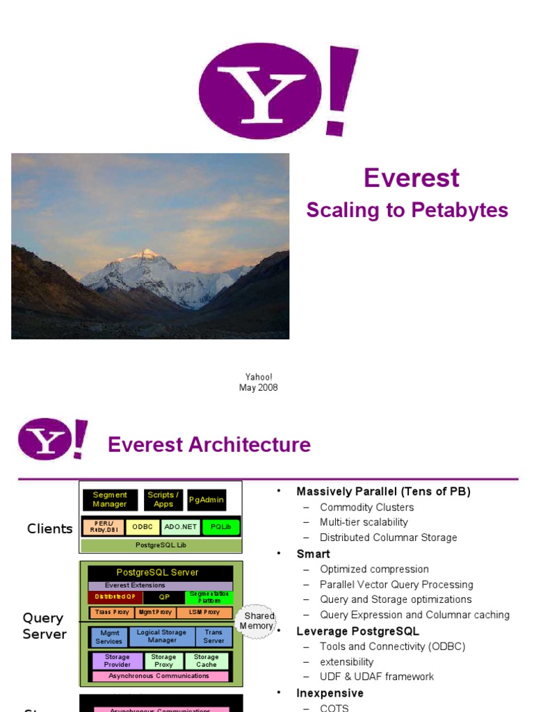 Everest Scaling to Petabytes Everest Architecture Segment Manager Scripts / Apps ODBC Massively Parallel (Tens of PB) Distributed Columnar Storage Optimized compression Parallel Vector Query…