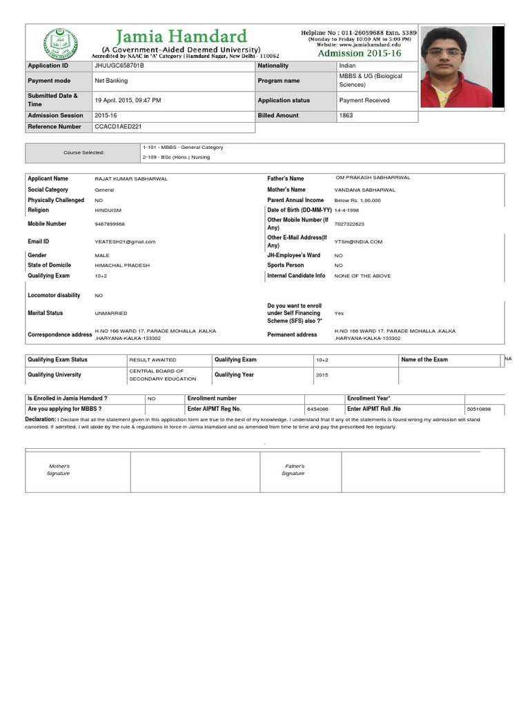 cancelled. If admitted, I will abide by the rule & regulations in force in Jamia Hamdard and as amended from time to time and pay the prescribed fee regularly.