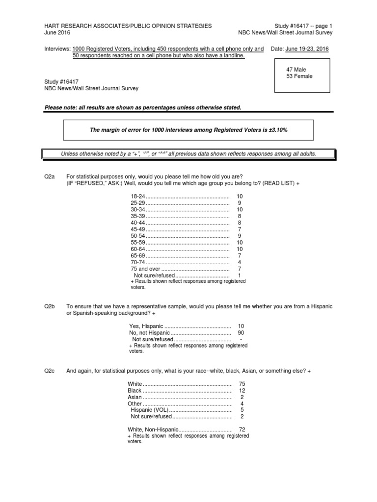 Interviews: 1000 Registered Voters, including 450 respondents with a cell phone only and Date: June 19-23, 2016 50 respondents reached on a cell phone but who also have a landline. Study #16417 NBC News/Wall Street Journal Survey