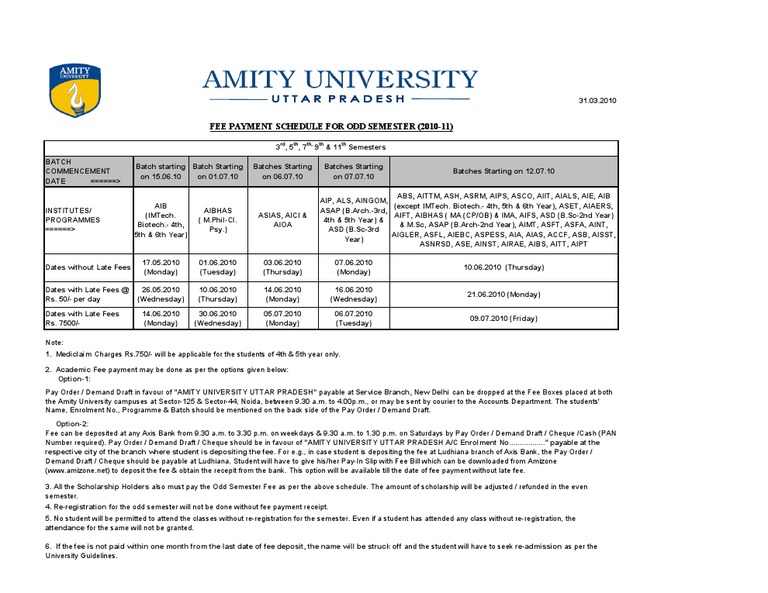 FEE PAYMENT SCHEDULE FOR ODD SEMESTER (2010-11)