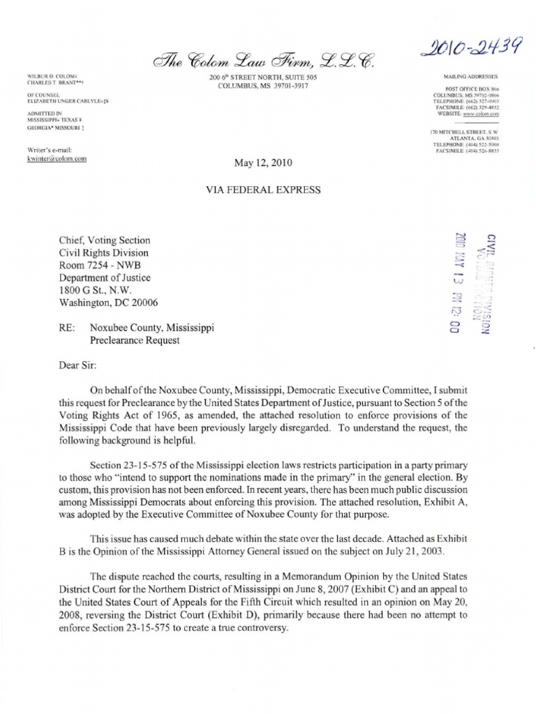 The Submission by Ike Brown and the Noxubee Democratic Executive Committee to the Justice Department seeking the power to restrict people's right to vote.