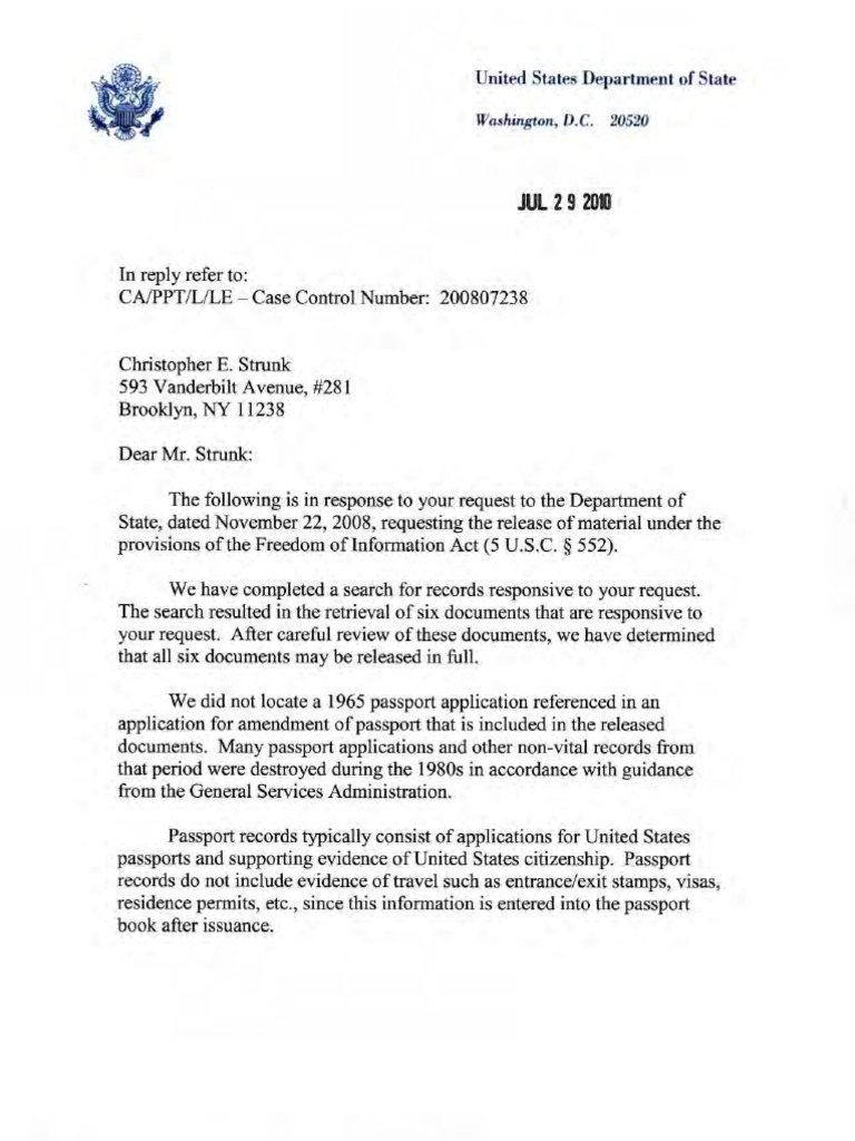 29 Jul 2010: Stanley Ann Dunham Obama Soetoro-Passport Application File-Strunk v Dept of State-FOIA Release-FINAL-7-29-10. Documents in this file are out of order. This file indicates via th…
