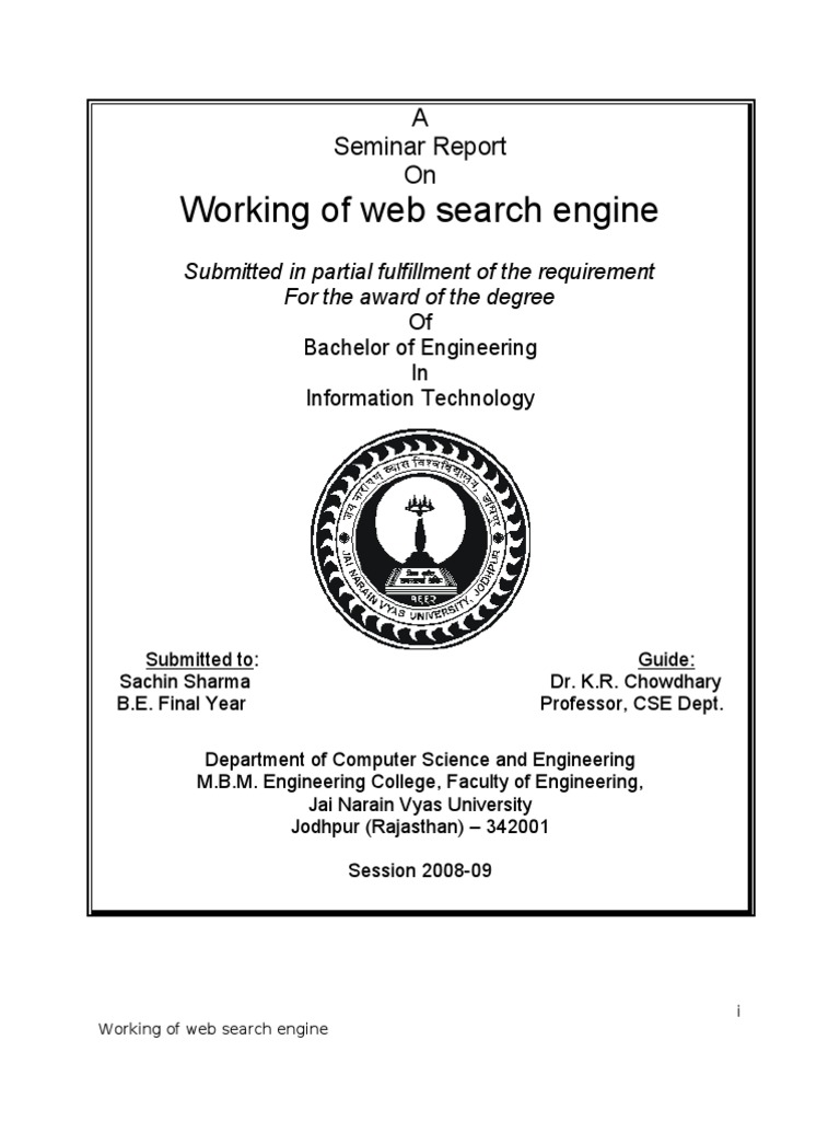 “Working of Web Search engine” in the partial fulfillment of the requirement for the
