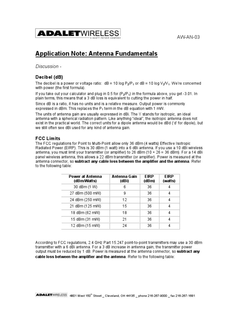 antenna, you must limit your transmitter (or amplifier) to 26 dBm (10 + 26 = 36 dBm). For a 14 dBi