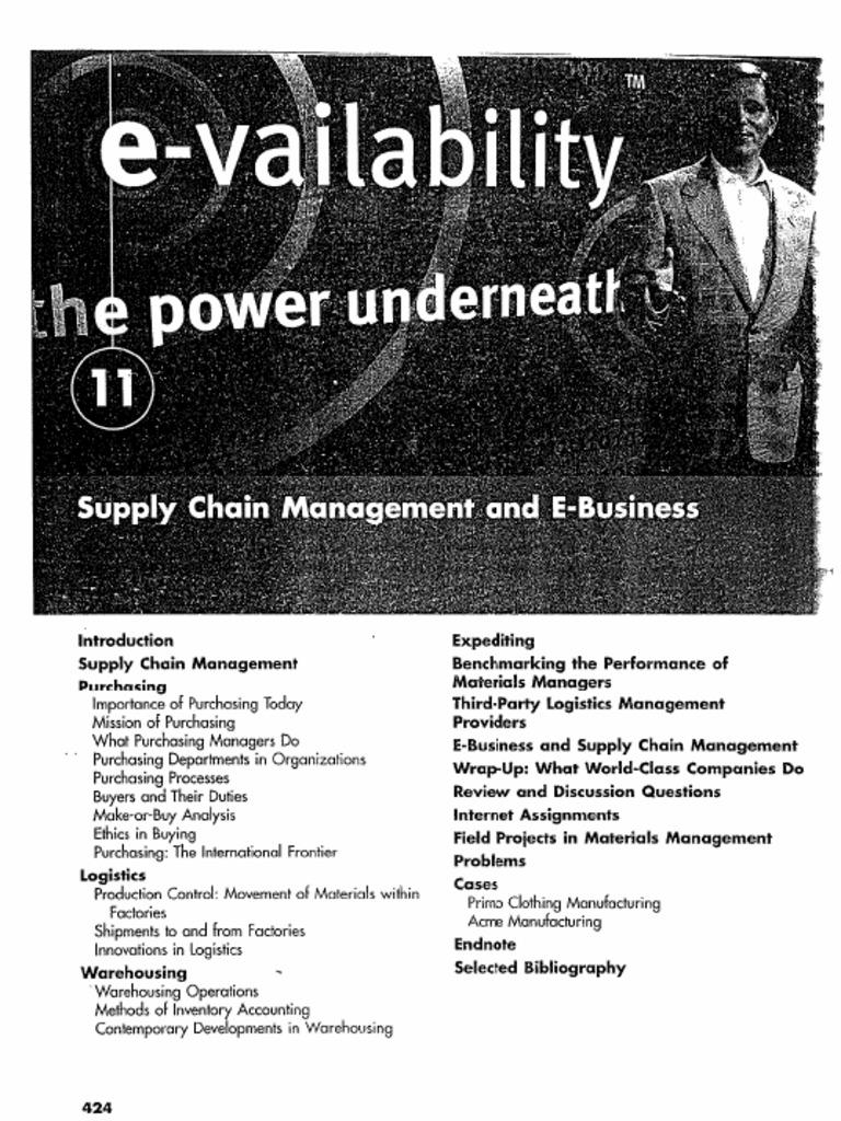 In this chapter we will first study supply chain management, including purchasing, logistics, warehousing, and related issues. We will then examine e-business and the impacts that e-business is having on supply chain management.