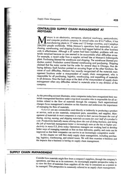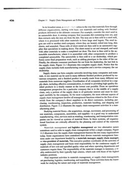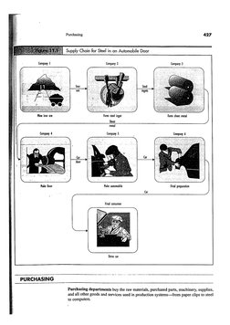 In its broadest sense, a <.;upph "h;lf~' refers to the way that materials flow through different organizations, starting with basic raw materials and ending with finished products delivered to the ultimate consumer. For example, consider the steel used in an automobile door. A mining company first excavates dirt containing iron are, and then extracts only the iron are from the dirt. The iron are is then sold to a steel mill, where it is processed with other materials to form large steel ingots. The steel ingots are sold to another steel company, where they are heated, rolled into long, thin sheets, and annealed. These rolls of sheet metal are then sold to an automotive supplier that specializes in making doors. The sheet metal is cut and stamped, and used' with other materials to make a completed car door. The door is then sold to the automobile manufacturer, where itis assembled with other components to produce a completed automobile. The automobile is then sold to a car dealership, which performs some final preparation work" such as adding pinstripes to the sides of the car. Finally, the ultimate consumer purchases the car from the dealership, the last link in the supply chain. Figure 11.1 illustrates this complete supply chain. Notice that the supply chain includes both manufacturing companies and a service company, the car dealership.