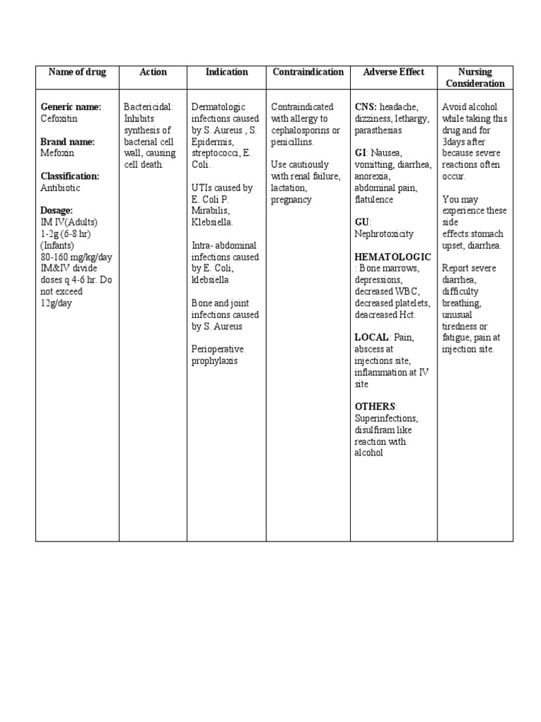 Name of drug Action Indication Contraindication Adverse Effect Nursing