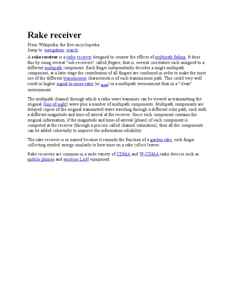 A rake receiver is a radio receiver designed to counter the effects of multipath fading. It does