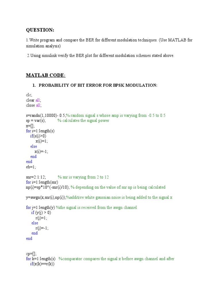 [Link] program and compare the BER for different modulation techniques. (Use MATLAB for