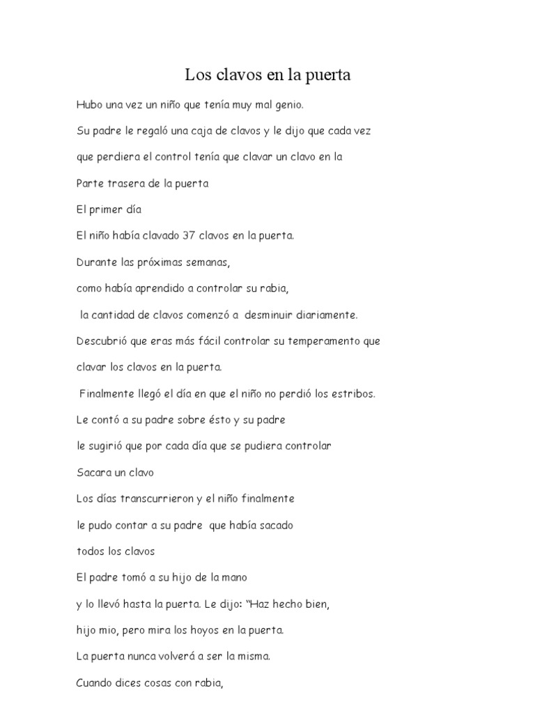 Hubo una vez un niño que tenía muy mal genio.Su padre le regaló una caja de clavos y le dijo que cada vezque perdiera el control tenía que clavar un clavo en laParte trasera de la puertaEl primer díaEl niño había clavado 37 clavos en la puerta.Durante las próximas semanas,como había aprendido a controlar su rabia,la cantidad de clavos comenzó a desminuir diariamente.Descubrió que eras más fácil controlar su temperamento queclavar los clavos en la puerta.Finalmente llegó el día en que el niño no perdió los estribos.Le contó a su padre sobre ésto y su padrele sugirió que por cada día que se pudiera controlarSacara un clavoLos días transcurrieron y el niño finalmentele pudo contar a su padre que había sacadotodos los clavosEl padre tomó a su hijo de la mano y lo llevó hasta la puerta. Le dijo: “Haz hecho bien,hijo mio, pero mira los hoyos en la puerta.La puerta nunca volverá a ser la misma.Cuando dices cosas con rabia,
