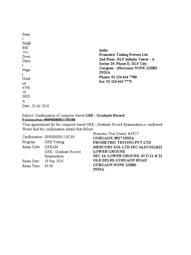 Subject: Confirmation of computer-based GRE - Graduate Record
