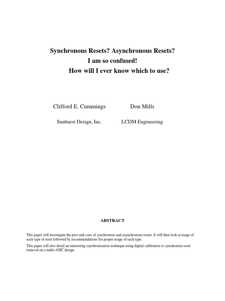 This paper will investigate the pros and cons of synchronous and asynchronous resets. It will then look at usage of